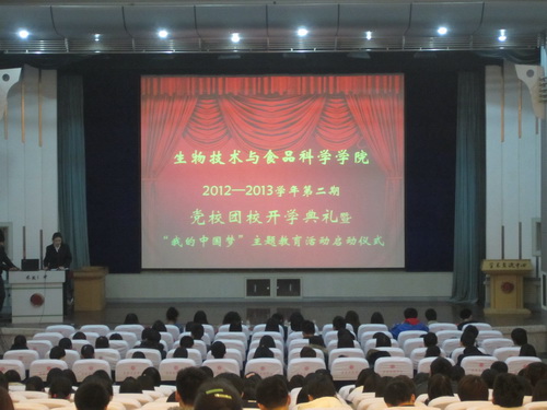 3 月 20 日下午,在雄壮的国歌声中,生物技术与食品科学学院 2012-2013 学年第二学期学生党校团校在学术交流中心拉开帷幕。院党委副书记孙文利,团委书记、学工办主任陈璐,辅导员、学生会秘书长陈相霓等老师以及研究生、本科生党团学各组织负责人出席,党校团校学员及基层班团组织骨干计 350 余人参加了开学典礼,共同开启了“我的中国梦”系列活动之旅。
