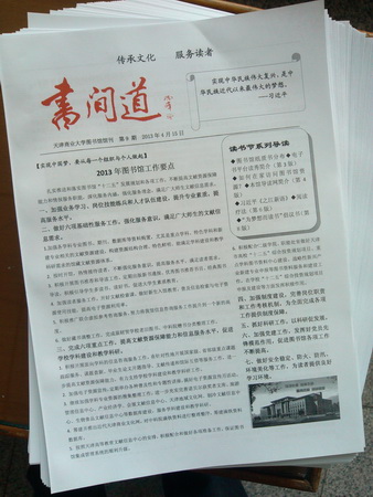 在 2013 年读书节来到来之际,作为图书馆文化服务年的活动之一,《书间道》总第 9 期(印刷版)重新改版推出。改版后的《书间道》在保留图书馆动态类以及读书推荐类的固定栏目外,还新增“资源和服务”栏目,会定期地向读者介绍图书馆提供的各种资源和服务及其使用方法,为读者提供更及时、全面的服务。
