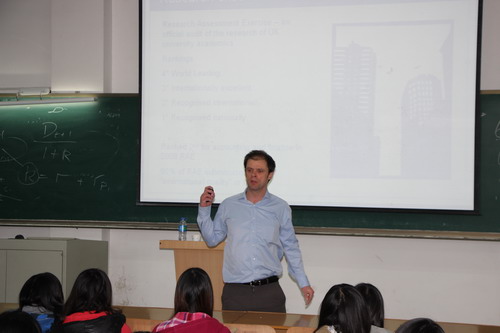 为进一步落实星空办学指导思想,强化内涵建设,推进对外开放和借鉴国外先进经验,深化和践行国际化办学理念,英国埃塞克斯大学商学院教授、国际事务部主任、帝国理工大学 Andrew 博士应我院邀请于 4 月 10 日来校进行学术讲座。金融系相关教师、 12 级硕士研究生及金融系 10 级本科生聆听了本次讲座。
