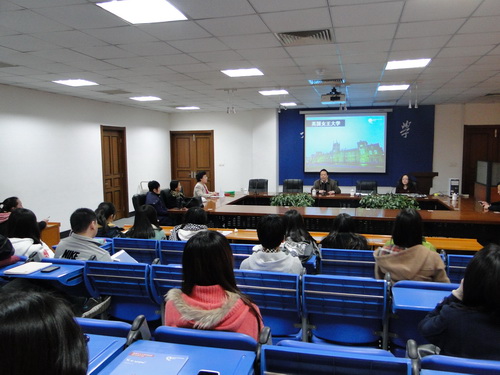 4 月 8 日下午,英国女王大学国际部官员莫妮卡( Monica H Yang )女士来校参加了由教学质量监控中心、国际交流处在图书馆二楼会议室召开的留学见面会,部分有出国意向的学生和学生家长参加了会议。