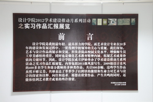 12 月 6 日 ,设计学院艺术设计专业主办的“ 2012 实习作品汇报展览”在图书馆二楼西厅开幕。本次展览作为设计学院学风建设推动月系列活动内容之一,将持续一个月。