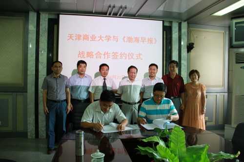8 月 21 日上午,公共管理学院与今晚传媒集团《渤海早报》传媒(天津)股份有限公司在星空多功能会议厅正式举行战略合作签约仪式。《渤海早报》总经理刘延军、《渤海早报》会展事业部经理刘晓亮,校党委宣传部部长张克明、教务处副处长曹军、公共管理学院党委书记白洪文、副院长李增田以及会展专业部分教师参加了签约仪式。