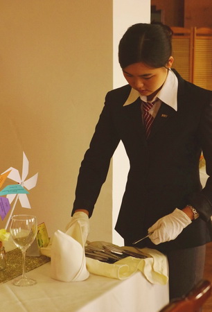 学生完全模拟高级西餐厅的组织管理理念,从每一种菜式的制作步骤、每一张餐桌的精心布置到每一样餐厅的装潢设计,都需要每一位学生有着充分的理论知识准备和默契的团队合作精神。