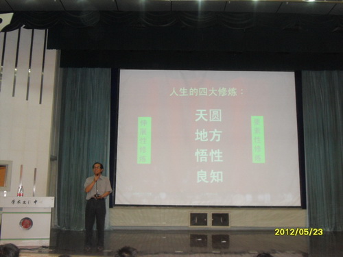 在演讲开始之前,信息工程学院许兆光老师发表开场白,他向在座大学生介绍了两本意义深远的书,名为《思想的寻找—与法国散文大师蒙田对话》和《自己的卦自己算——现代生存智慧》,并把书中精髓与大家分享,从而引出了本次演讲的主讲人刘广起先生。首先,刘广起先生与听众分享了一句话——“人一直在解释的路上且无尽头(史铁生)”,围绕这句话,展开了演讲的主题——“人生大哲学”,本次演讲的重点有三个,第一为人生的大哲学,他针对人生的命运做了阐述,他说,无可奈何谓之命,对于我们无法改变的事,要学会妥协;而自我把握的谓之运,能把握的一定要把握好。第二为成功人要具备的三大因素:其一为懂得亦正亦邪的规则,其二有个人的文化突破,其三要学会自我保护。刘广起先生从甲骨文的形、义的角度出发,分析了个人的三次文化突破,他亲身演绎了甲骨文中的“人”,“大”,“众”,“王”,“天”等字的形状,并配以诙谐幽默的故事,深入阐释了每个甲骨文字蕴含的人生哲理,观众时时报以热烈掌声,演讲者和听众互动频繁,气氛活跃,达到了一个又一个高潮。针对自我保护的话题,刘广起先生提出了几个非常务实的观点,他倡导奉献不无私,正义别冲动,合作契约化,做好事要做心理能承受的,给同学们带来了新鲜又值得深思的新思想。第三为大学生如何修炼,他用极度精炼的语言阐述了当今大学生应该具备的素质 — 好气质,好书法,好口才,好学问,好脾气,同时送给大家八个字,即大学生修炼四要—“天圆”,“地方”,“悟性”,“良知”,意义深远,字字珠玑。本场演讲高潮迭起,演讲者激情澎湃,听众配合积极,可谓一场真正的思想碰撞。
