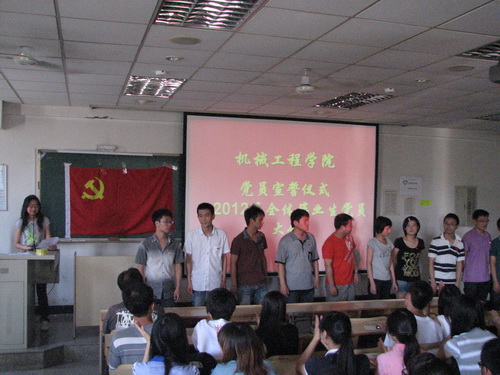 6月15 日上午,机械工程学院党委在四号教学楼202 举行2011-2012学年新党员宣誓仪式及全体毕业生党员大会。机械工程学院党委副书记刘振强出席仪式,机械工程学院团委书记、学工办主任田海荣主持仪式,81 名新党员参加活动。