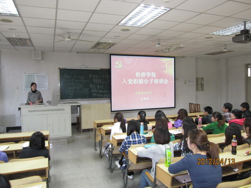 为了贯彻落实《经济学院 2012 年党组织建设工作方案》,紧密围绕“基层组织建设年”,以《党组织规划建设没目标体系》为切入点,加强党员的教育培训和规范工作。 4月13 日经济学院在4 号教201室召开了入党积极分子培训会。培训会由王欣欣老师主讲。