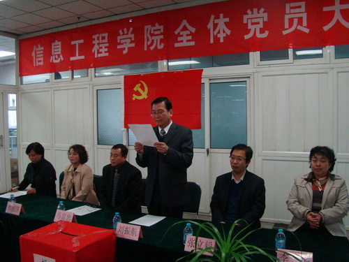 11月16日下午 ,在信息交流中心四楼中厅布置了会场,在庄严的党旗下,隆重召开了信息工程学院全体党员大会,进行学院党委换届选举,除一位同志作为志愿者离津支援西部教育外,学院全体党员出席了本次大会。