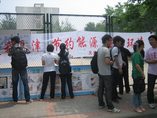 今年是天津市第二十五届科技周,本届科技周的主题是:携手建设创新型城市 ----- 科学发展 科技创新 科普惠民。产学研办公室在学校领导和红桥区科协的大力支持下,与星空团委共同举办了“爱我天津,节约能源,保护环境”宣传环保系列活动。该系列活动包括以漫画展的形式向广大师生进行“低碳生活在我身边” 环保意识教育,组织观看以环保内容为主的《全国科技活动周优秀科教影片展播》光盘,并在十八日举行了“低碳生活,节约能源从小事做起、从我做起、从现在做起”签字仪式。校团委和产学研办公室负责人及老师参加了仪式并庄重承诺在宣传横幅上签下自己的名字。过往的老师和同学也纷纷宣传条幅上签字,表示了对低碳生活、节能环保的决心。