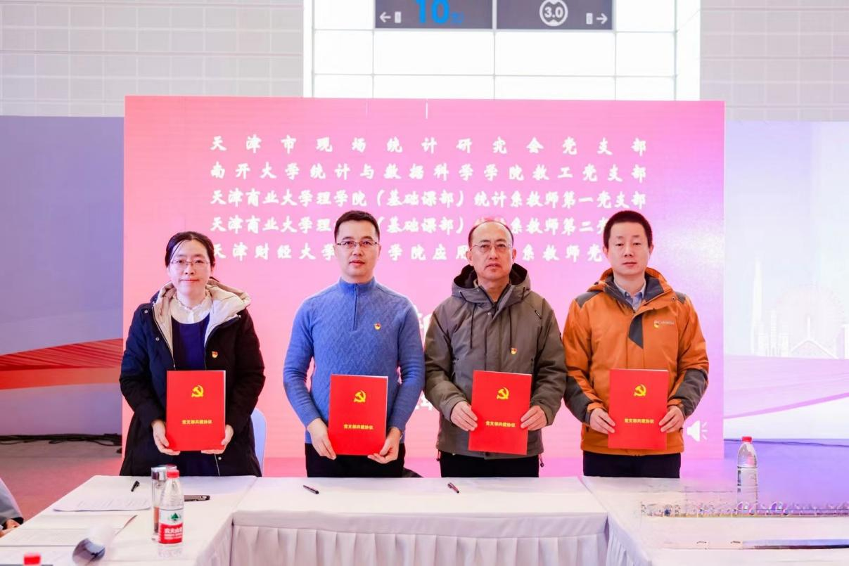 会上,理学院统计系教师第一党支部和第二党支部与天津市现场统计研究会党支部、南开大学统计与数据科学学院教工党支部、天津财经大学统计学院应用统计系教师党支部签订了党支部共建协议。理学院副书记、院长安建业提出希望通过开展党支部共建,依托现场统计研究会高层次人才聚集平台,发挥全国党建工作样板党支部南开大学统计与数据科学学院教工党支部的示范引领作用,不断增进党支部学习交流,搭建产教融合互学互鉴桥梁,更好地服务于京津冀一体化建设和数字化转型发展。天津市现场统计研究会党支部和南开大学统计与数据科学学院教工党支部书记杨建峰表示希望通过支部共建,实现党建经验共享、组织交流共建、业务优势互补、支部文化共融,取长补短、共同进步,努力形成各党支部优势互补、资源共享、共同发展的党建工作新格局,推动党建与事业发展双促进、双提升。