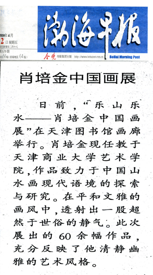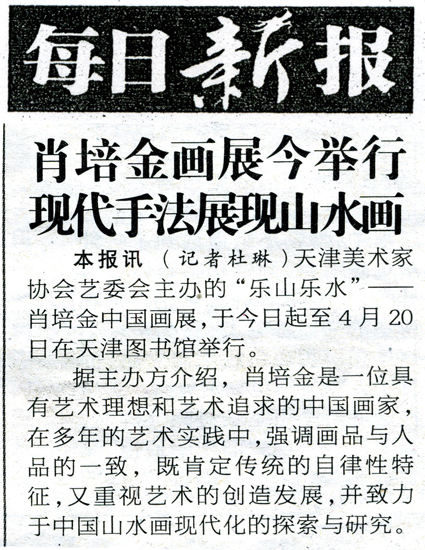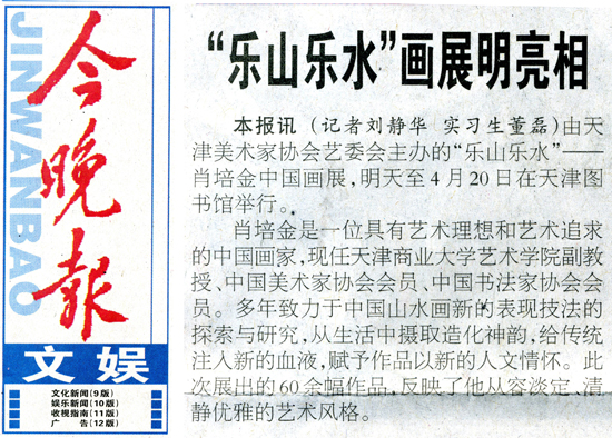 由天津美术家协会艺委会主办的“乐山乐水”——肖培金中国画展, 4 月 2 日 至 4 月 20 日 在天津图书馆举行。肖培金老师是星空艺术学院副教授、中国美术家协会会员、中国书法家协会会员。多年致力于中国山水画新的表现技法的探索与研究,多副作品在我市和全国国画中参展,受到业界的好评。《晨钟》 2001 年参加“建党八十周年全国美展”; 2002 年座客中央电视台《真情无限》栏目,为环保事业捐赠竞拍《雪归图》,所拍款项全部捐赠国家绿色工程;《寒梅图》 2003 年参加“菜乡情”全国中国画提名展,《新血液》参加“全国美术书法精品展”;《松岩天界开》 2004 年参加中国画名家邀请展,《晨钟》参加“画说天津六百年大型画展”,《山庄青烟》参加全国中青年中国画提名展,《冷艳幽香》 2007 年参加“齐白石奖中国画作品展”,分别在日本、韩国举办个人画展; 2008 年由甘肃画院承办的“培金水墨——肖培金中国画展”在兰州甘肃美术馆举办;《雪山流云》 2009 年参加“全国第五届中国美协会员中国画精品展。其作品《黄土地的希望》 1999 年被中央电视台收藏;《张骞出使西域》 2000 年被敦煌博物馆收藏;《溪亭论道》 2001 年被中央电视台书画院收藏;《雪归图》 2002 年被天津丰泽电子集团收藏;《新血液》 2003 年被中国美术家协会收藏;《山庄青烟》 2004 年被齐白石艺术馆收藏;《苦吟图》 2008 年被中国教育学会书法教育委员会收藏,《春雪》被人民大会堂收藏;《溪山论道图》 2008 年被甘肃美术馆收藏,《秋水》被甘肃画院收藏;《大漠风情》 2009 年被印度大使馆收藏;《春山读书图》 2010 年被天安门城楼收藏。 《里程碑》 2002 年获 “5.23 全国美展 ” 优秀奖,并获天津展区金奖, 2002 年荣获教育部全国学校艺术教育先进工作者;《寒梅图》 2003 年获 “ 菜乡情 ” 全国中国画提名展优秀奖;《山庄青烟》 2004 年获全国中青年中国画提名展银奖; 2005 年被评为天津市优秀青年美术家;《富贵图》 2008 年获 “ 天津市第二届花鸟画大展 ” 优秀奖。被中国文联授予 “ 海峡两岸德艺双馨艺术家 ” 。 此次展出的 60 余幅作品,反映了他从容淡定、清静优雅的艺术风格。天津日报、今晚报、每日新报、渤海早报先后作了专题报导。