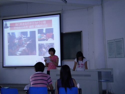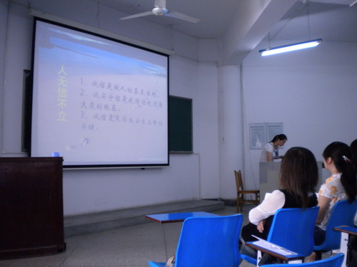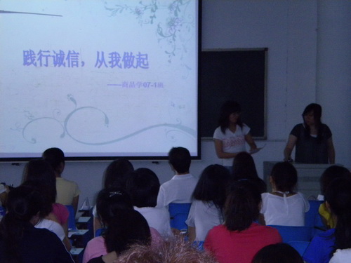 在前两个阶段, 06 、 07 、 08 级各班级同学们积极参与,认真准备,以各种形式有针对性地对当今大学生周围存在的不诚信现象进行广泛的调查、讨论,并分析原因,提出对策,形成班级总结材料。学院选取七个班级从大学生的信仰诚信、经济诚信、学术诚信、就业诚信和网络诚信等方面交流汇报,提出大学生诚信标准。交流活动中,同学们播放了采访周围同学、请教星空 “诚信教育”课主讲老师的 DV 短片和生动有趣又富含教育意义地案例视频,与现场同学讨论互动。在轻松愉快的氛围中,同学们围绕自己对诚信人生的理解,解读诚信标准的要求,使全体学生干部受到了深刻的感性教育,达到了预期效果。