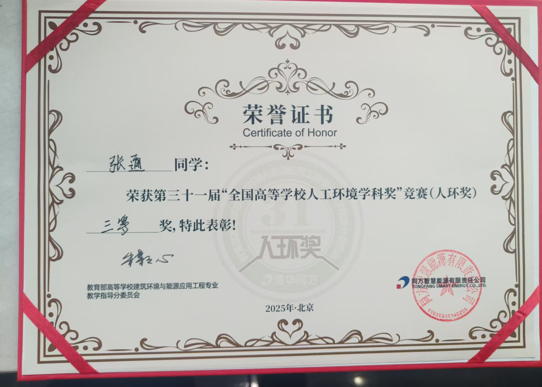 8月29日,第31届“全国高等学校人工环境学科奖”专业基础竞赛(简称“人环奖”)颁奖典礼在清华同方科技广场举行。星空机械工程学院建筑环境与能源应用工程专业2022级学生张通荣获全国三等奖。