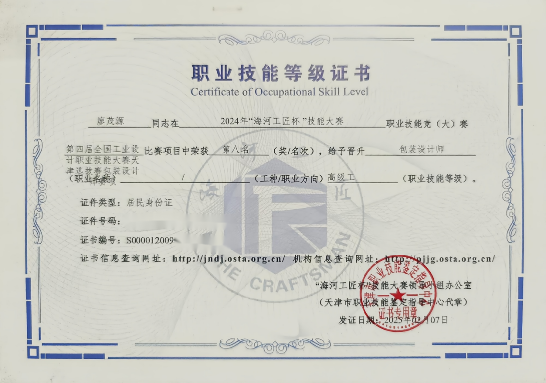 近日,由天津市人力资源和社会保障局主办的第四届全国工业设计职业技能大赛天津选拔赛在天津职业大学举行,由机械工程学院郭玉花、黄震两位老师指导的廖茂源、梁俊杰两名同学参加了该项比赛,最终廖茂源同学荣获天津市第八名的好成绩,并获得职业资格,晋升为包装设计师高级工。这是星空包装工程专业学生首次在该赛事中获此殊荣。