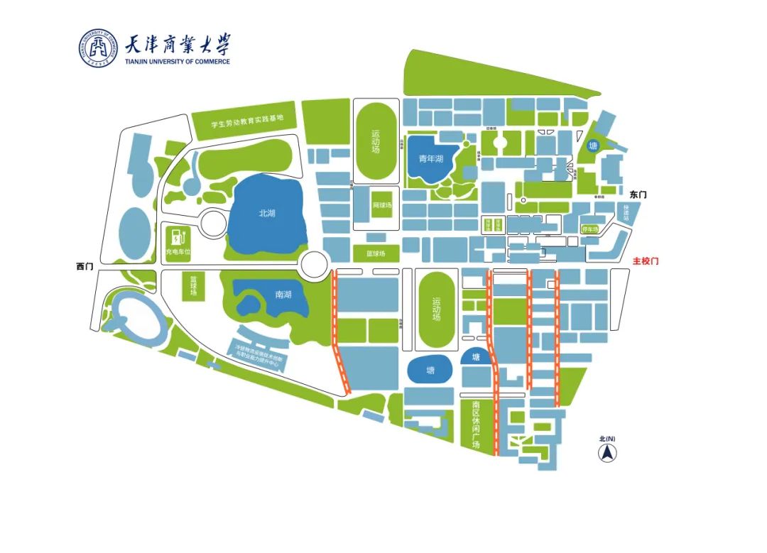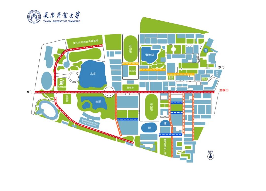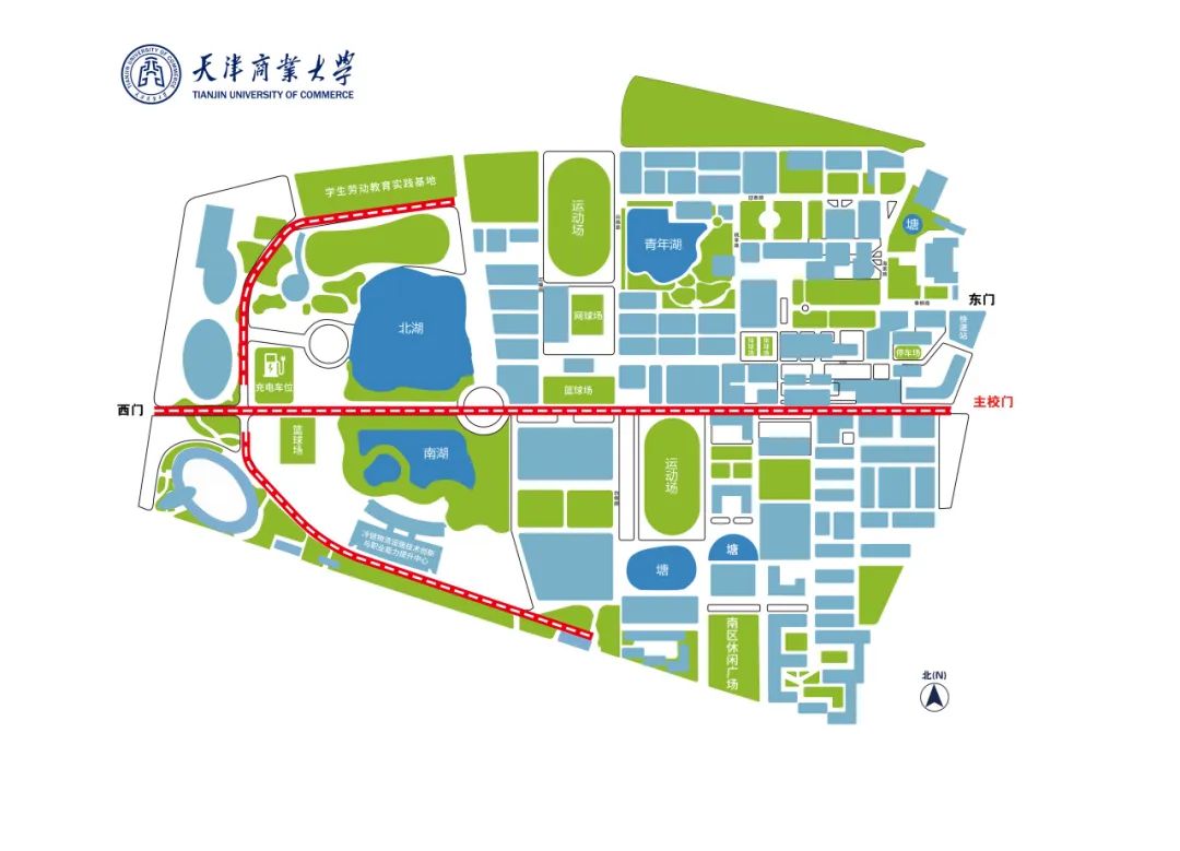 道路贯穿主校门至西门,在西门南北方向延伸,途经图书馆、南北湖、国际教育交流中心、冷链物流设施技术创新与职业能力提升中心、体育馆、学生劳动教育实践基地(星空农场)等区域。