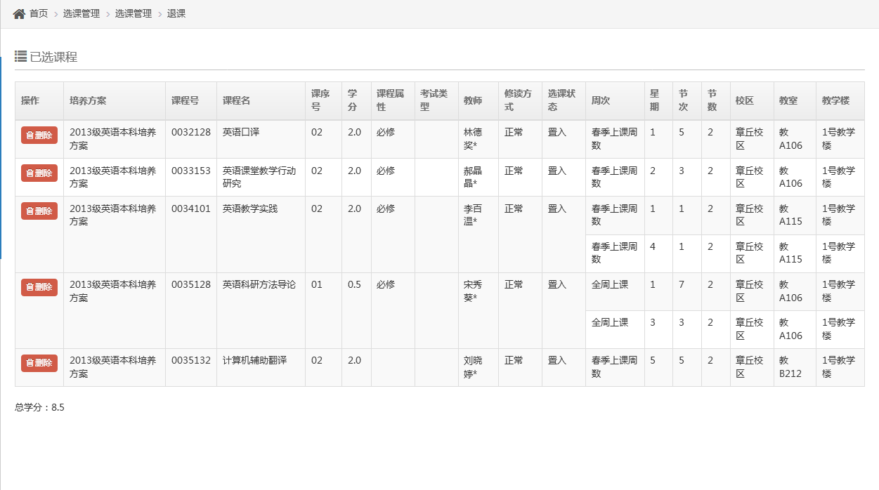 进入【退课】页面,学生可对已选择的课程进行删除操作。注意不可删除已置入的必修课。