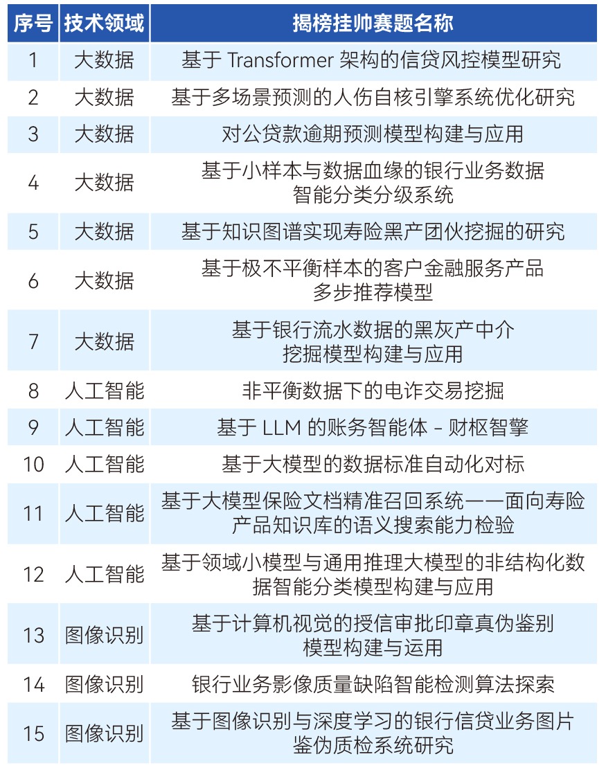 “揭榜挂帅”主赛道围绕大数据、人工智能与图像识别 3 大技术领域,共15 个可供揭榜的赛题,赛题列表如下(具体赛题说明详见《附件 2:第四届中国研究生金融科技创新大赛“揭榜挂帅”赛题指南》):
