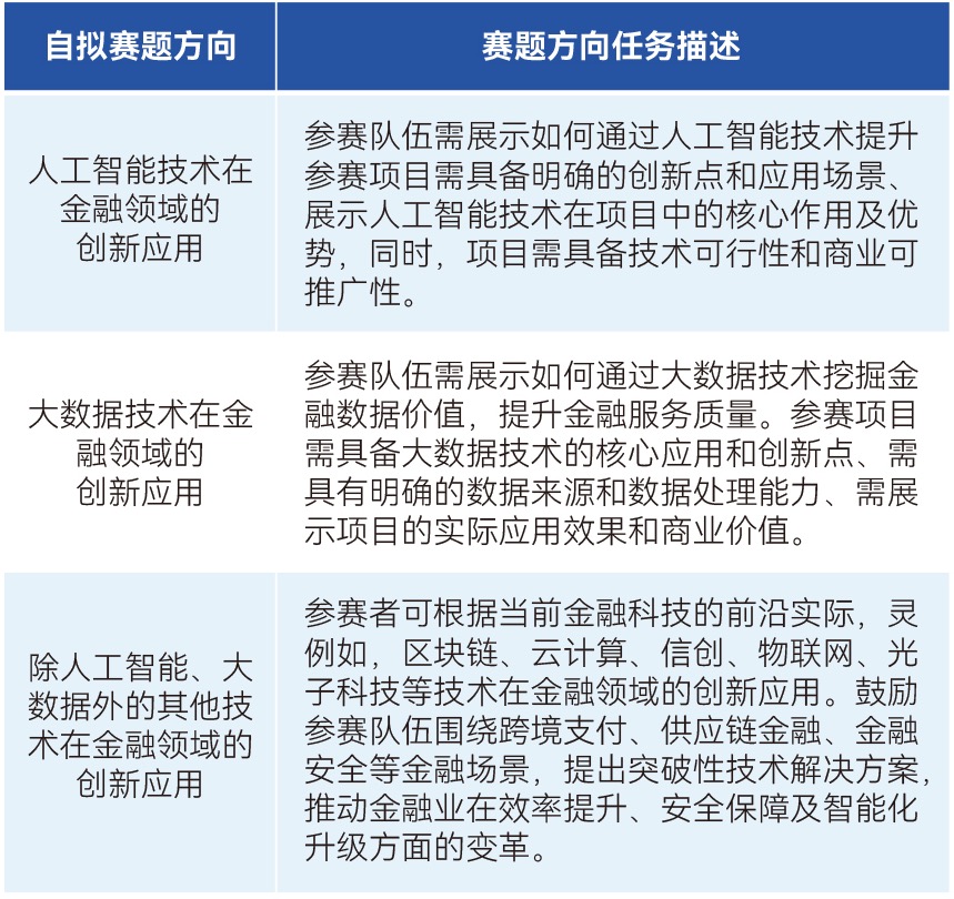 大赛筹备阶段,承办方通过多轮深度沟通对接区域金融创新需求,从30余个企业提案中精选出15个兼具技术创新性、落地可行性与行业应用价值的企业“揭榜挂帅”赛题。同时,保留3个自拟题目方向(原成长赛道),形成兼具创新性与落地潜力的赛题体系, 既对接金融机构实际业务需求,又为高校团队提供多元化创新空间。 现面向全国研究生公开发布赛题,诚邀各团队携创新方案踊跃报名,共赴金融科技攻关实践。