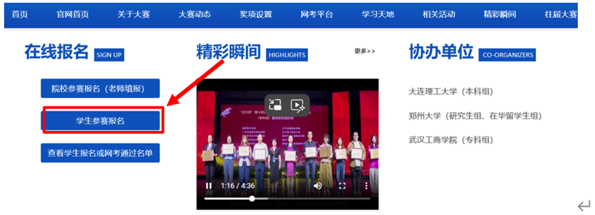 (三)下拉右侧滚动条至在线报名,点击学生参赛报名。