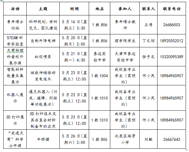 为更好的提高社会化科普服务效能和水平,更好的对接社会需求,让科技创新理念深入人心,5月16日至26日,学校开展天津市第32届科技周进校园活动。活动由学校科协主办,理学院承办。