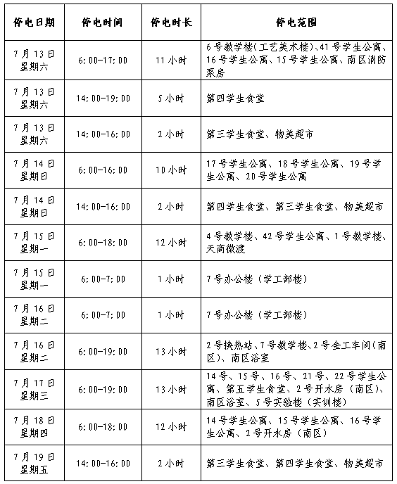 因学校供电改造,需要停电施工,将影响南区部分楼宇供电。停电时间和范围如下: