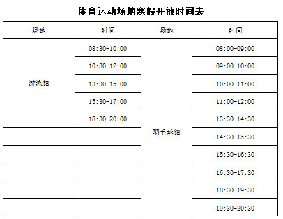 开放日期为1月13日至1月22日;2月1日至2月18日,春节闭馆日期为1月23日至1月31日。其他场馆寒假进行维修养护,如遇场馆维修等特殊情况,开放时间另行通知。体育场馆开放咨询电话:26669479。