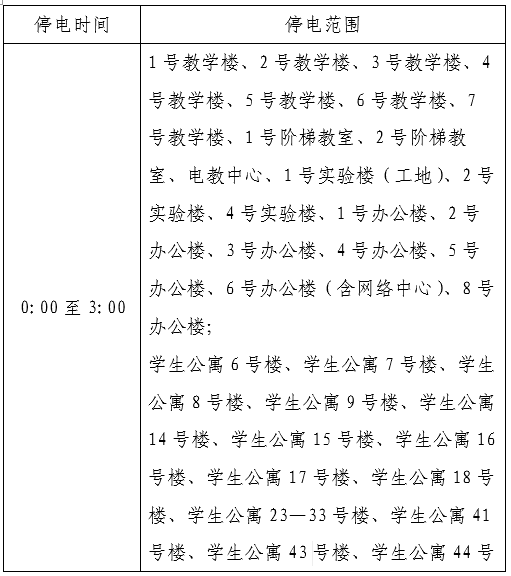 因学校35kV变电站供电切换,需要停电操作,将影响学校部分建筑供电。停电时间为2021年9月7日(星期二),分区域切换,停电时间及范围如下: