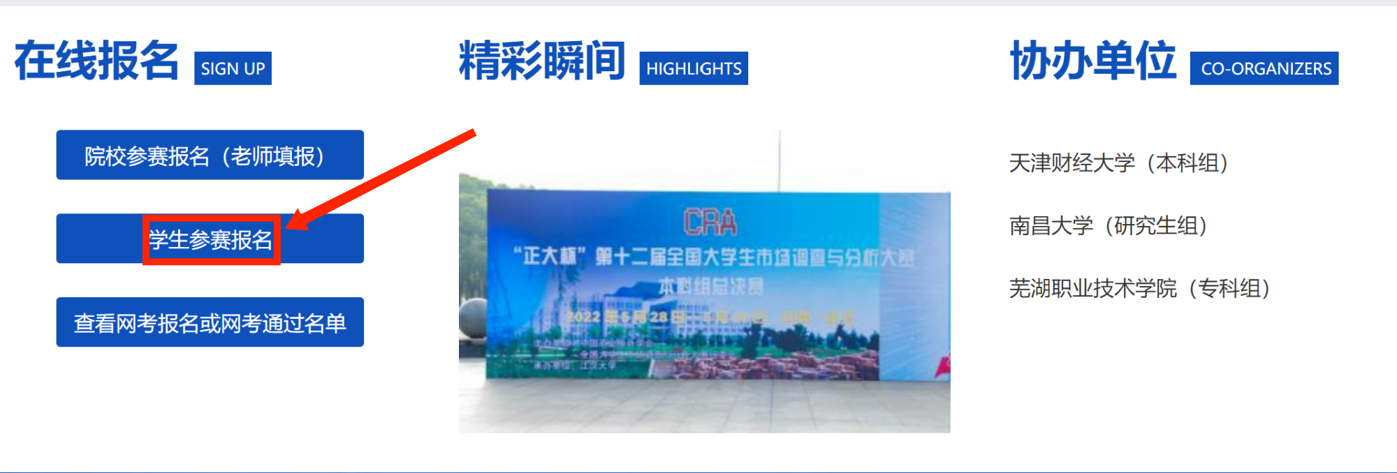 (三)下拉右侧滚动条至在线报名,点击学生参赛报名。