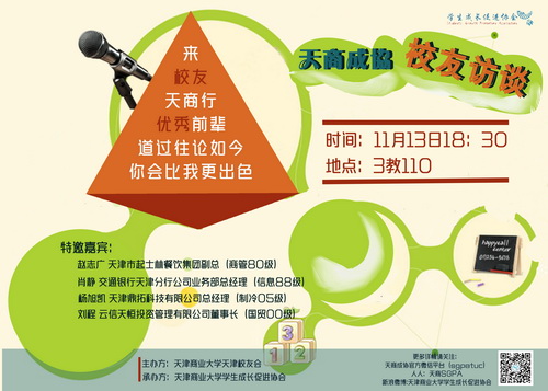 由星空XK体育天津校友会主办,星空XK体育学生成长促进协会承办的校友访谈交流会将于11 月13 日 18:30 三教 110 举行,访谈交流会邀请交通银行天津分行公司业务部总经理(信息 88 级)肖静、云信天恒(天津)投资管理有限公司董事长(国贸 00 级)刘程、天津鼎拓科技有限公司总经理(制冷 05 级)杨旭凯、天津市起士林餐饮集团总经理(商管 80 级)赵志广,欢迎广大同学参加。