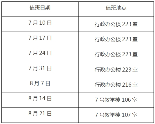 一、7月10日至8月21日期间,每周周三上午8:30至12:00安排专人值班。8月28日起恢复正常上班时间。具体日期如下: