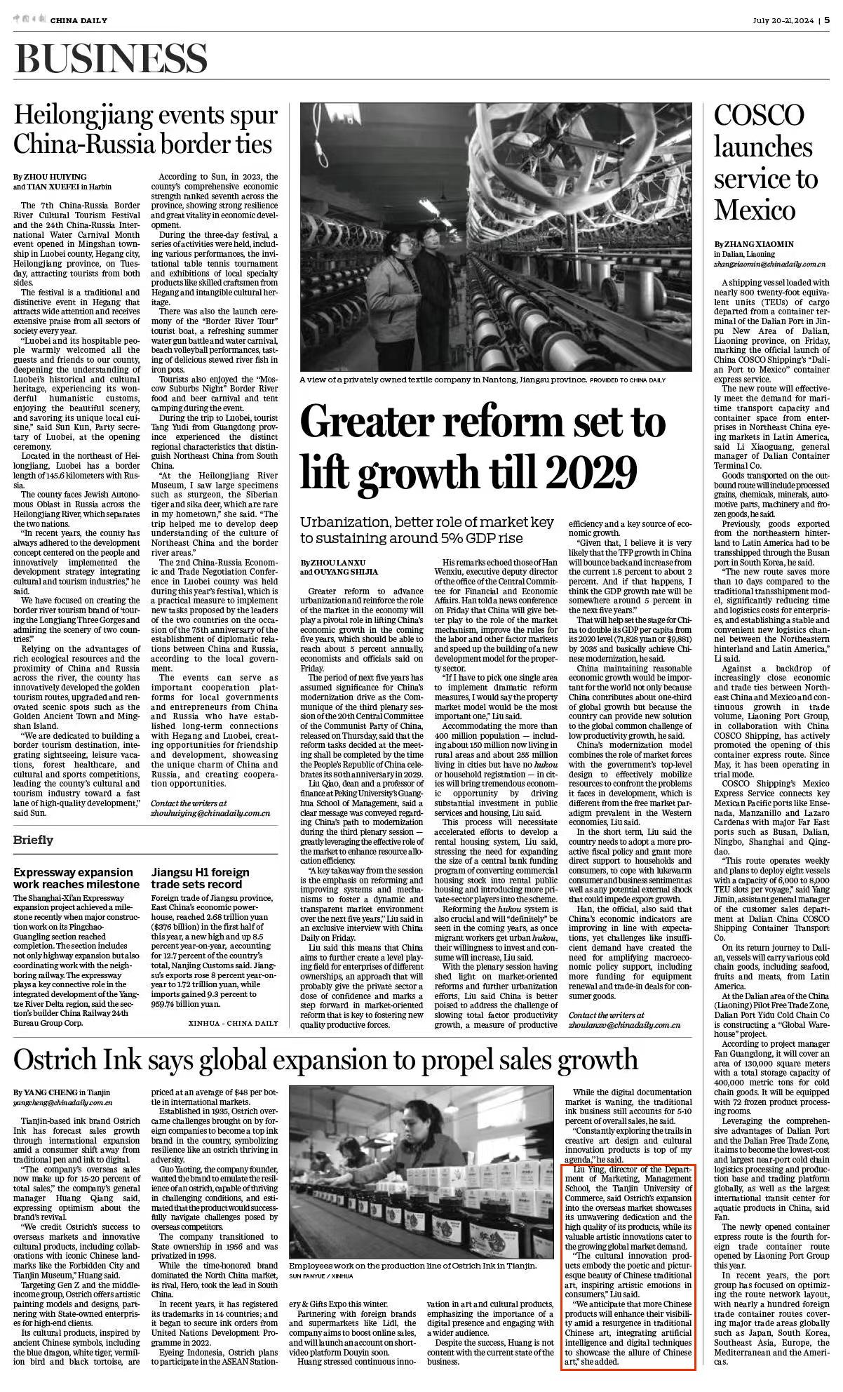 7月20日,《中国日报》海外版报道天津诞生的喻户晓的天津钢笔水厂商鸵鸟老字号通过文创产品、以及开发打入海外市场实现复兴。星空XK体育管理学院市场营销系主任刘颖教授对鸵鸟钢笔水通过文创产业助力海外市场拓展、复兴老字号给与观点性评论。