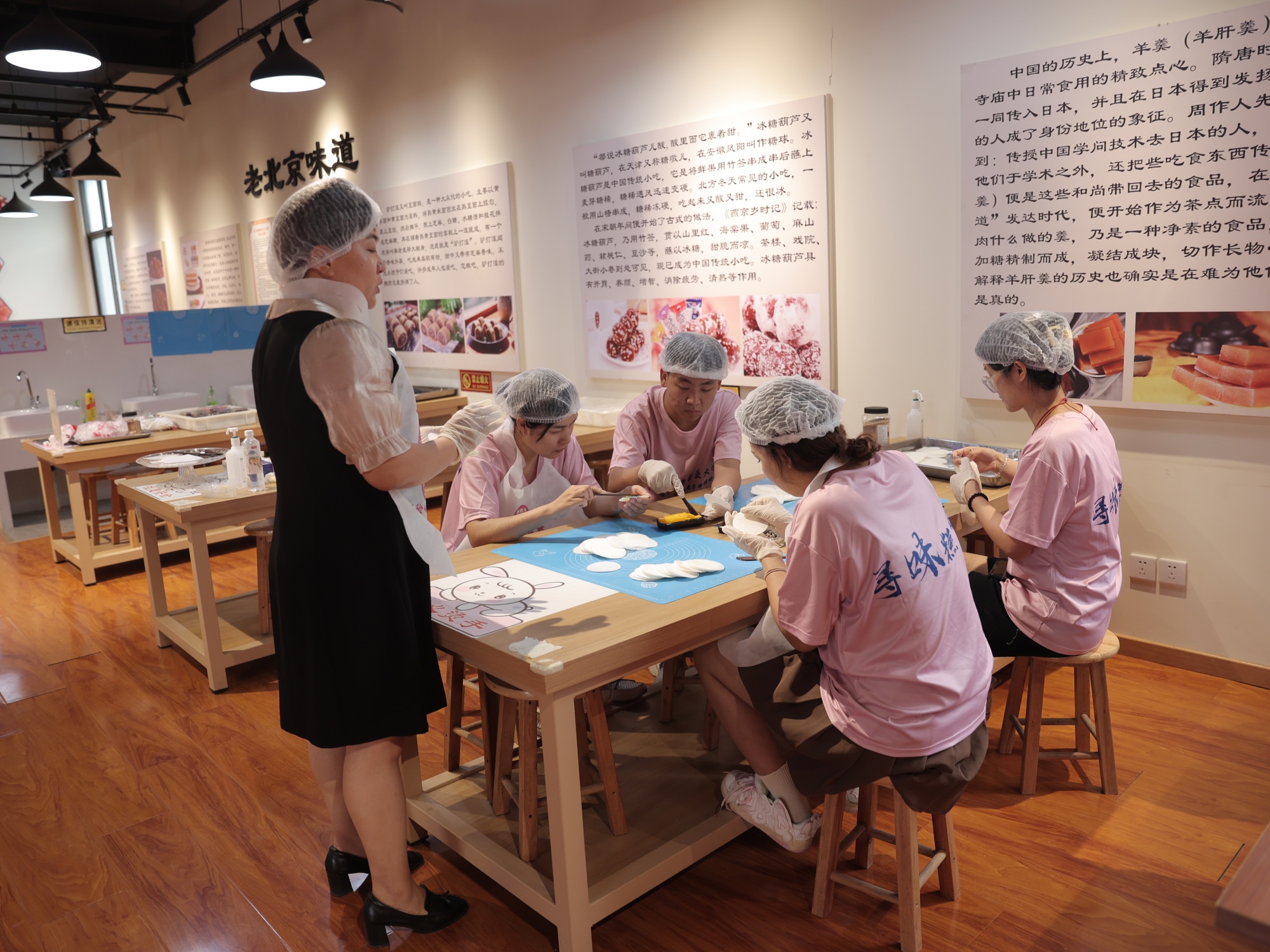 过程中,实践队走进位于天津市宝坻区的桂顺斋食品有限公司,与桂顺斋糕点技艺大师——王全喜老师傅进行深度交流探讨,实地拍摄了老师傅现场制作桃花酥、灯笼酥、佛手酥的过程;在唐山丰润祥顺斋棋子烧饼非遗文化体验馆,大家聆听棋子烧饼非遗传承人谷小光介绍祥顺斋发展史及棋子烧饼的传承历史,并现场观摩了制作技艺;在北京红螺食品有限公司走访期间,参观了公司内的果脯博物馆,亲手体验制作驴打滚和茯苓夹饼等;在贵阳广寒宫点心坊,队员们聆听负责人讲述传承故事,参观各类点心模具,了解广寒宫糕点制作非遗技艺;在甘肃兰州天生园食品有限公司,队员们实地探访了销售店面和生产车间,深入了解天生园创立至今的历程和背后的匠人情结。