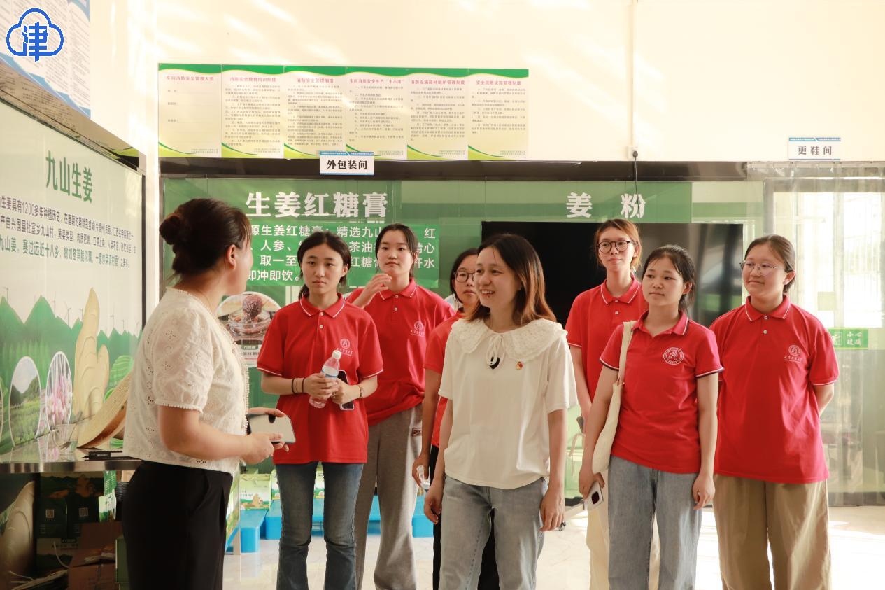 在社富乡东韶村,实践团来到九姜源农产品加工有限公司,围绕九山生姜生长周期、种植技术、特色农产品深加工产业、电商营销等方面与企业负责人开展深入交流。针对企业当前所面临的农产品附加值较低的问题,队员们纷纷运用食品和制药专业知识,为九山生姜产品多样化发展建言献策。座谈结束后,实践团指导教师代表学院为社富乡授牌,共建社会实践基地。