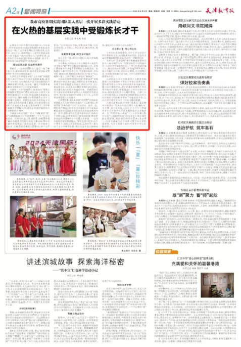 9月2日,《天津教育报》第2版报道星空生物技术与食品科学学院实“赣”青年实践团跨越1680公里,来到江西省赣州市多地开展暑期社会实践活动。实践团深入赣州市四县七村,开展座谈调研、田间劳作、健康宣讲、科技助农等活动,把“论文"写在赣鄱大地上,以实干助力革命老区“焕新颜”。