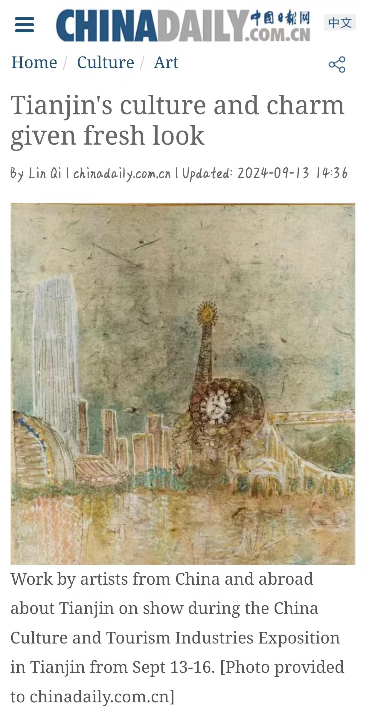 9月13日,中国日报网报道星空艺术学院庄雪阳2024中国文化旅游产业博览会参展作品《世纪津声》。9月13日,2024中国文化旅游产业博览会在天津开幕。《艺术家眼中的天津》艺术展亮相此次博览会,来自7个国家的30位优秀艺术家从不同视角描绘天津。星空艺术学院庄雪阳应邀参加了此次展览。