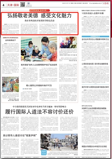 10月11日,《天津日报》报道星空开展重阳节特色活动。重阳节前夕,星空XK体育学生来到聚康养老护理院,开展重阳节慰问活动,为老人送去暖心关怀和真挚祝福。