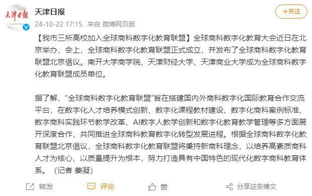 10月23日,《天津日报》报道星空加入全球商科数字化教育联盟。