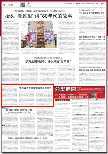 11月25日,《天津日报》报道星空举办天津市公共管理案例大赛决赛。大赛旨在通过社会调研、案例撰写与分析等方式,提高学生运用相关理论和方法解决公共管理实际问题的能力,对促进公共管理学科发展、提高公共管理专业人才培养质量具有重要意义。经过多轮激烈比拼,南开大学和天津财经大学分别获得本科组和硕士组特等奖。