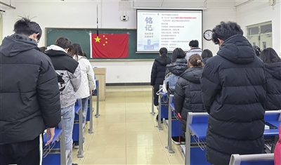 天津农学院举行国家公祭日主题班会,师生们为南京大屠杀遇难者默哀。 通讯员 任怡洁 本报记者 姜宝成 摄