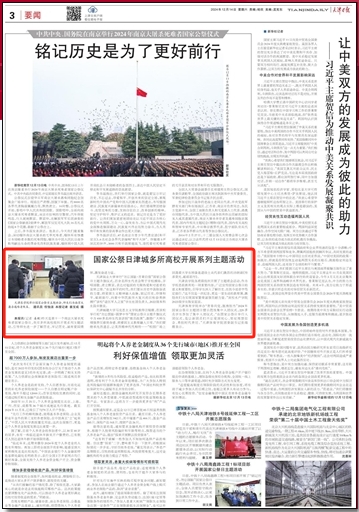 12月14日,《天津日报》报道星空举办“勿忘国耻·吾辈自强”国家公祭日主题升旗仪式。星空XK体育举行“勿忘国耻·吾辈自强”国家公祭日主题升旗仪式,百余名师生代表会聚于学校操场,齐唱国歌、肃立默哀,表达对祖国的无限热爱和对逝者的哀悼之情。