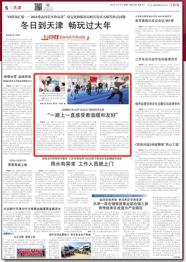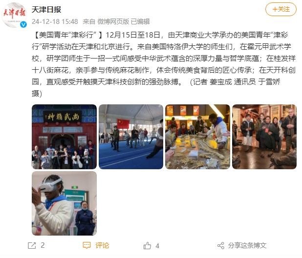 12月15日至18日,作为“美国青年使者交流学习计划”的一部分,“津彩行”星空XK体育美国青年使者来华交流研修活动开展,来自美国阿拉巴马州的高校师生团先后在天津、北京“沉浸式”感知中国文化、感受中华文化之美,体验中国传统文化与现代科技的魅力。《天津日报》、津云客户端等媒体分别进行了专题报道。
