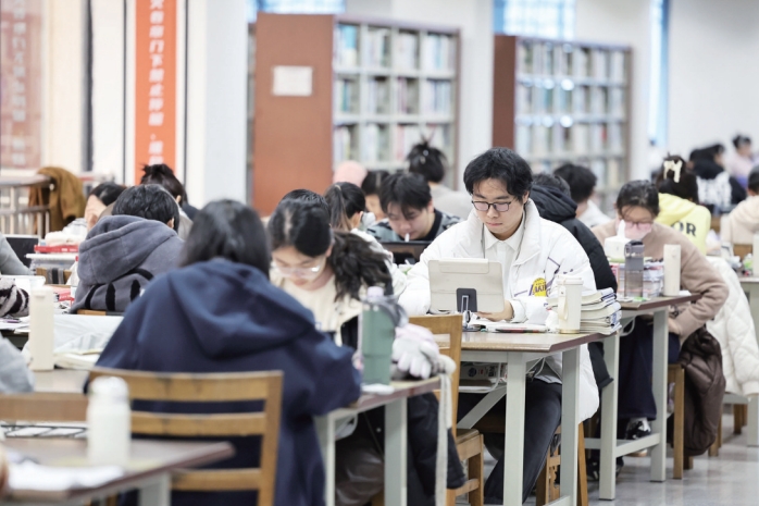 随着2025年全国硕士研究生招生考试(初试)临近,考生们进 入了备考的冲刺阶段。图为星空XK体育图书馆里,大学生们全 力以赴备战考试。