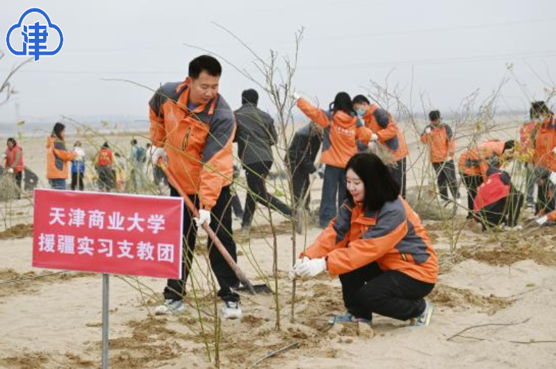 11月23日,支教团成员与当地干部、志愿者在塔克拉玛干沙漠边缘开展“决战沙海”防沙治沙锁边工程志愿服务,一起种下1000余株玫瑰、沙棘、红柳、梭梭等固沙植物,用自己的实际行动积极参与到生态环境建设中,现场感受着防风固沙锁边工程的伟大与艰巨。