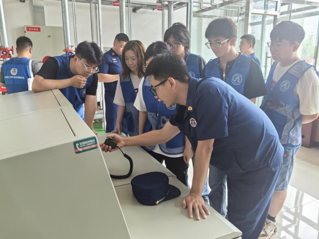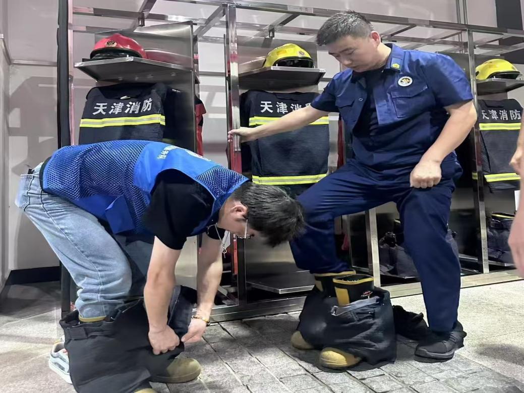 “沉浸式”消防应急体验。在北辰区消防救援支队教育基地,“星空蓝”消防安全社会实践团在消防员的指导下开启“沉浸式”体验活动,与消防员一同开展穿消防服、爬梯训练、通道救援、疏散逃生等基础训练,全过程体验火情出警及救援。同时,团队成员还近距离参观各类消防车辆及破拆工具等专业设备,深入学习了用电安全隐患排查、校园火灾预防、扑救初期火灾和逃生自救等知识。