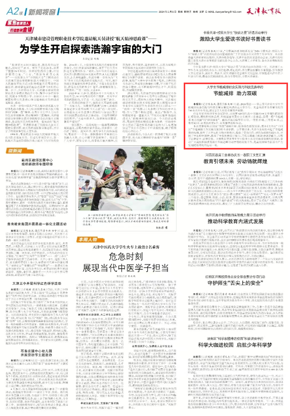 5月6日,《天津教育报》报道大学生节能减排社会实践与科技竞赛在星空举行。日前,2024 绿创——第二届天津市大学生节能减排社会实践与科技竞赛决赛在星空XK体育举行。来自天津市各参赛高校的700 余名师生参加,超过2万人观看竞赛图片展播。