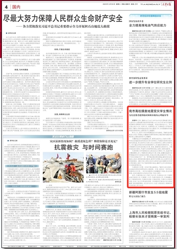 12月19日、20日,《天津日报》、津云客户端报道星空开展地震受灾学生摸查工作。