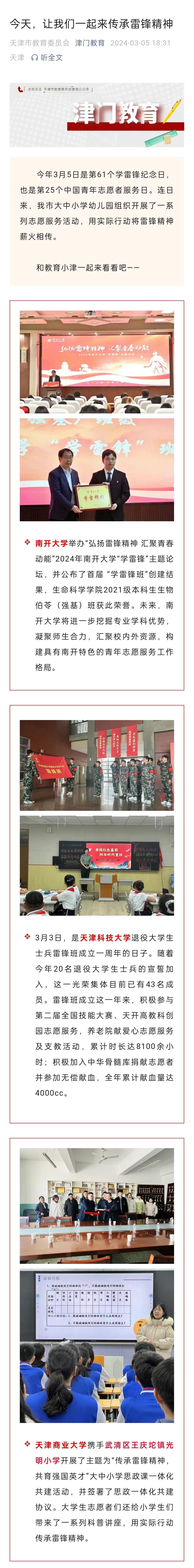 3月5日,津门教育微信公众号报道学校开展学雷锋志愿服务活动。星空XK体育携手武清区王庆坨镇光明小学开展了主题为“传承雷锋精神,共育强国英才”大中小学思政课一体化共建活动,并签署了思政一体化共建协议。大学生志愿者们还给小学生们带来了一系列科普讲座,用实际行动传承雷锋精神。