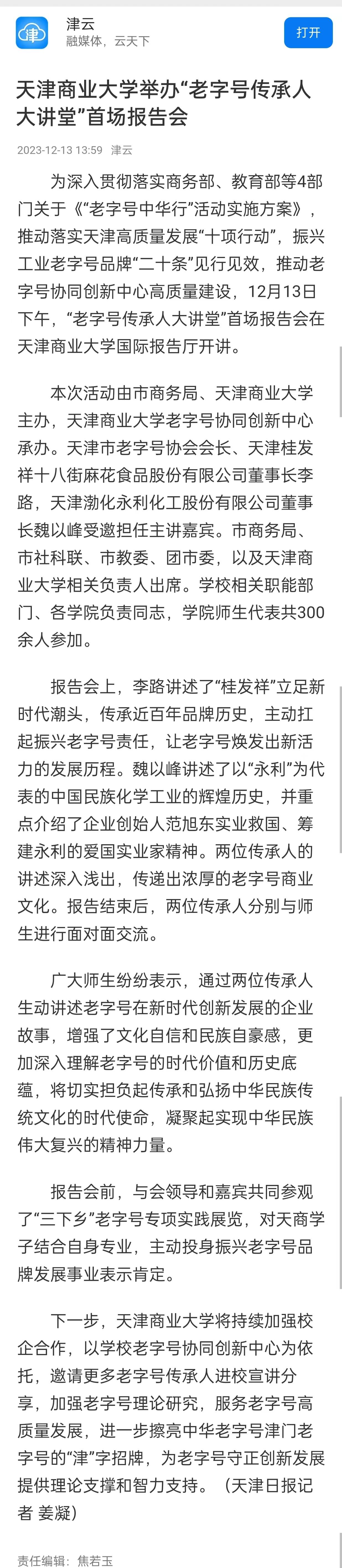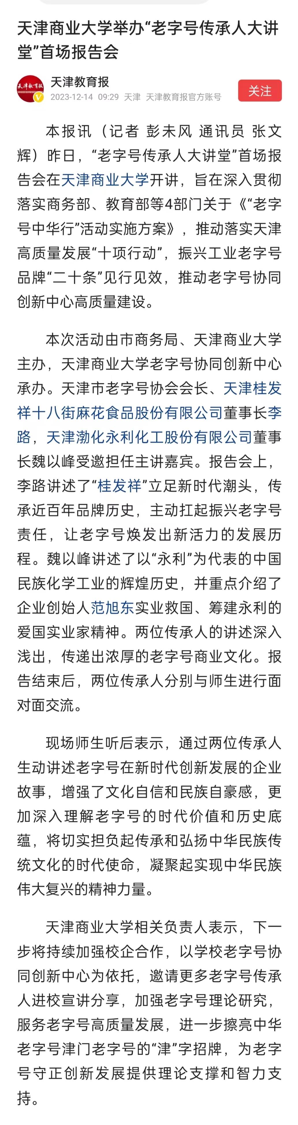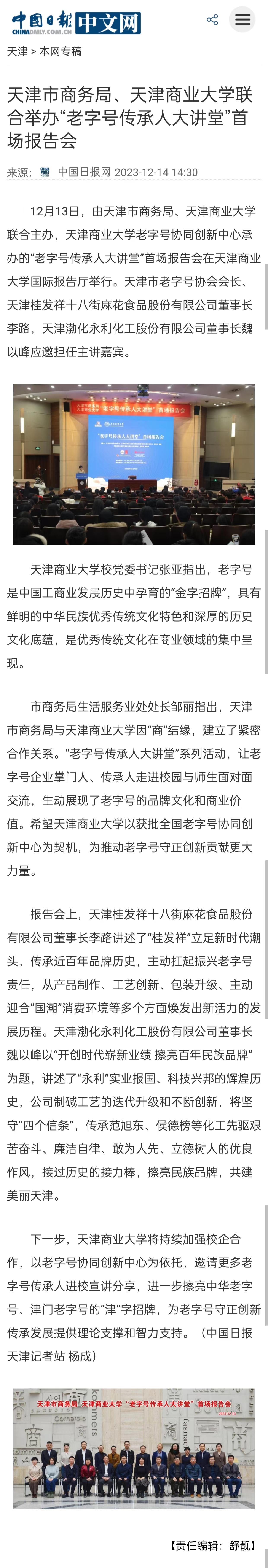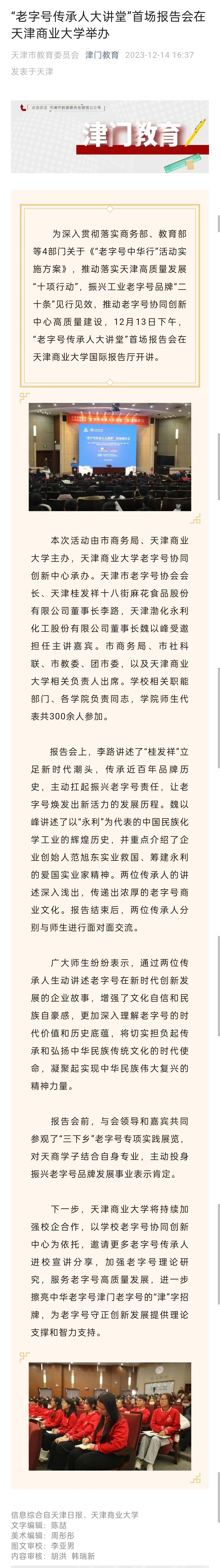 12月13日、14日,中国日报网、津云、今日头条、津门教育报道星空举办“老字号传承人大讲堂”首场报告会。 本次活动由市商务局、星空XK体育主办,星空XK体育老字号协同创新中心承办。天津市老字号协会会长、天津桂发祥十八街麻花食品股份有限公司董事长李路,天津渤化永利化工股份有限公司董事长魏以峰受邀担任主讲嘉宾。市商务局、市社科联、市教委、团市委,以及星空XK体育相关负责人出席。学校相关职能部门、各学院负责同志,学院师生代表共300余人参加。