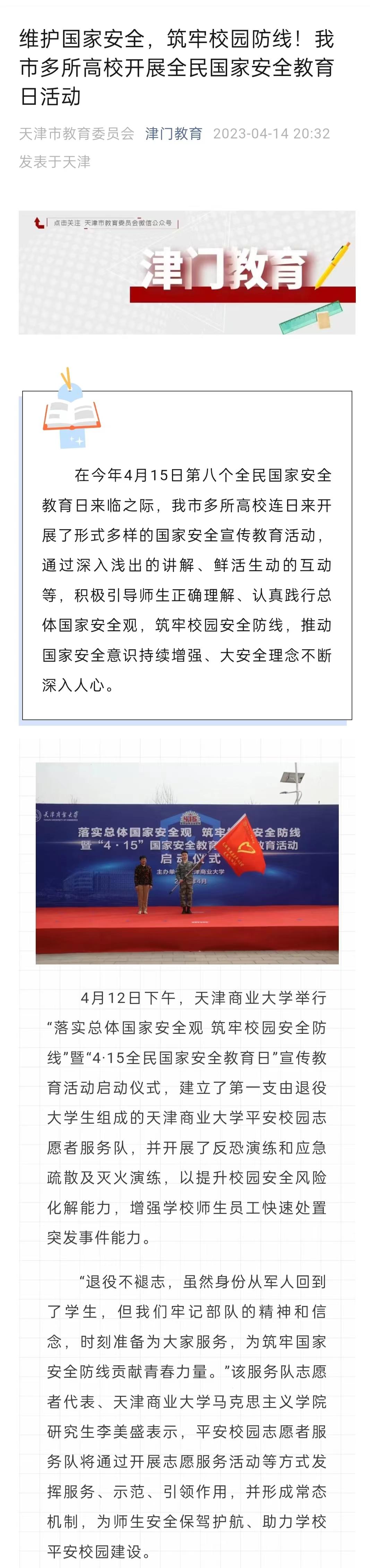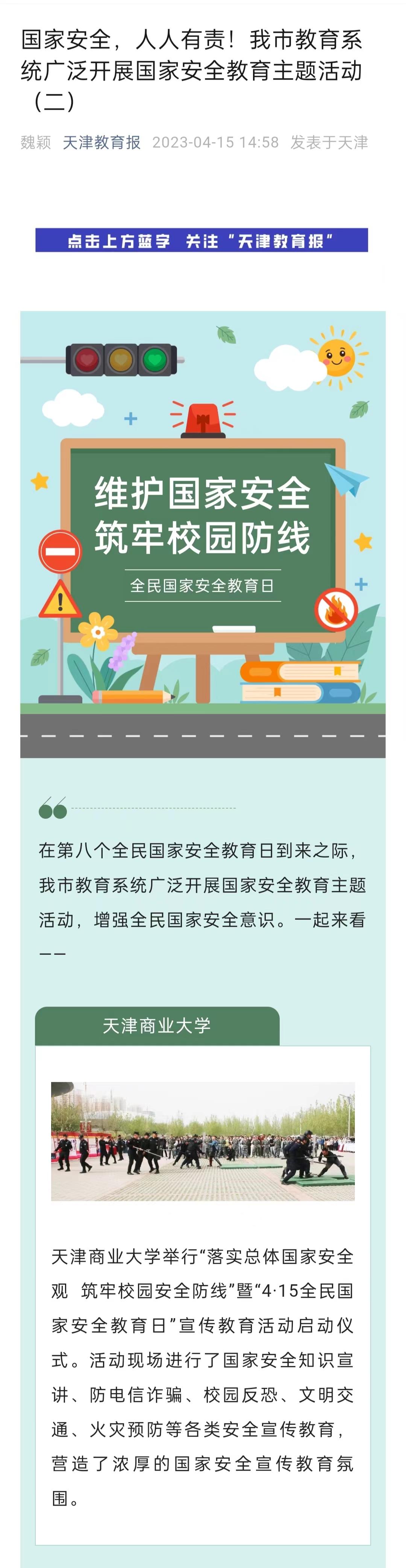 日前,《天津教育报》、津门教育微信公众号报道学校开展国家安全教育主题活动。星空XK体育举行“落实总体国家安全观 筑牢校园安全防线”暨“4·15全民国家安全教育日”宣传教育活动启动仪式。活动现场进行了国家安全知识宣讲、防电信诈骗、校园反恐、文明交通、火灾预防等各类安全宣传教育,营造了浓厚的国家安全宣传教育氛围。