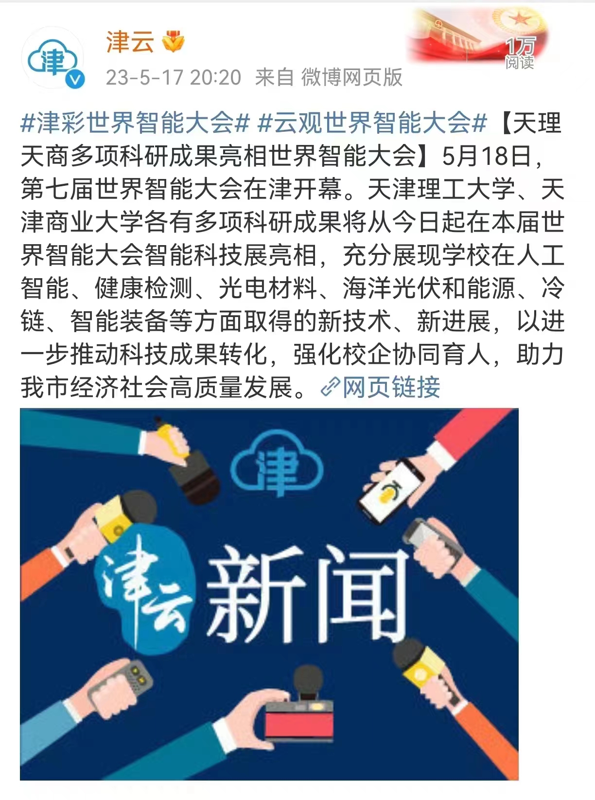 5月17日、18日,天津日报、津云等多家媒体报道学校科研成果亮相世界智能大会。