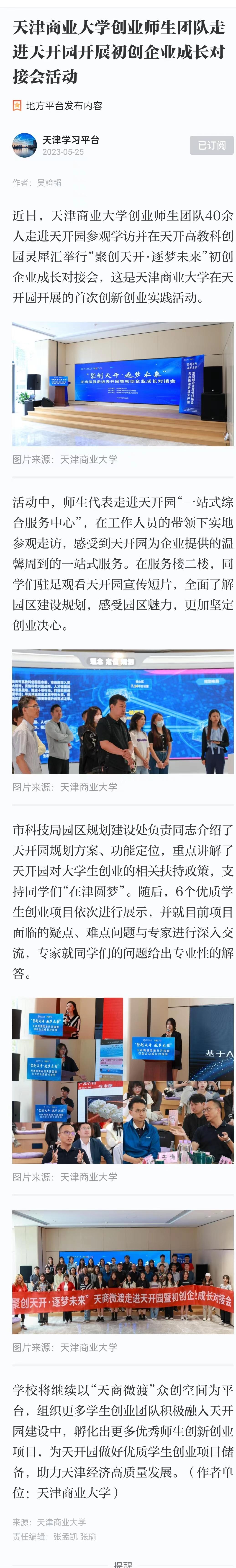 5月25日,学习强国天津平台报道学校创业师生团队走进天开园开展初创企业成长对接会活动。近日,星空XK体育创业师生团队40余人走进天开园参观学访并在天开高教科创园灵犀汇举行“聚创天开·逐梦未来”初创企业成长对接会,这是星空XK体育在天开园开展的首次创新创业实践活动。